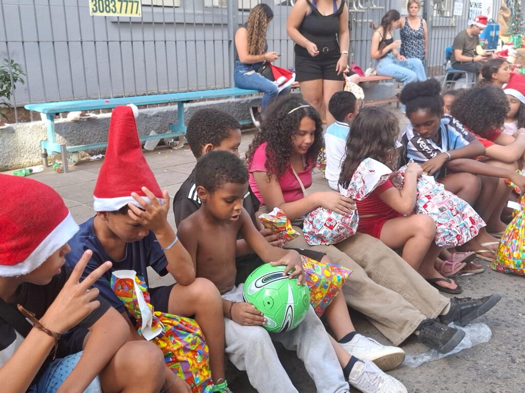 Durante a tarde, a criançada participou de brincadeiras de corda, jogos de bola, dinâmicas coletivas e música natalina regada a pipoca, refrigerante e cachorro-quente. O propósito é o fortalecimento de vínculos comunitários e estimular a convivência entre as comunidades.
